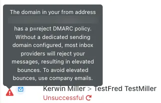 „Für die Domäne in Ihrer Absenderadresse (khan@pilotly.io) gilt die DMARC-Richtlinie ap=reject. Ohne eine dedizierte Absenderdomäne lehnen die meisten Posteingangsanbieter Ihre Nachrichten ab, was zu einer erhöhten Bouncerate führt. Um eine erhöhte Bouncerate zu vermeiden, verwenden Sie Firmen-E-Mails.“