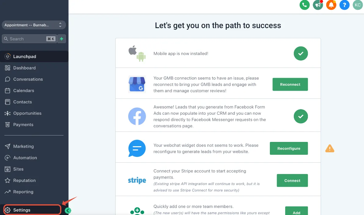 Sobald Sie am Standort sind, klicken Sie auf Einstellungen -> E-Mail-Dienst s