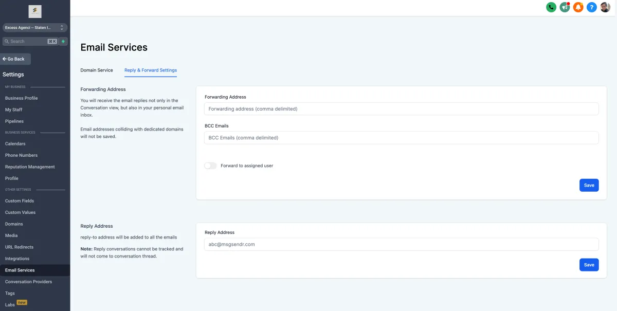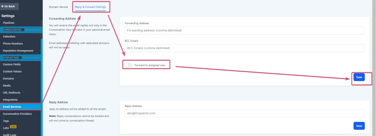 Jetzt haben wir die Möglichkeit, eine Antwortadresse hinzuzufügen. Alle eingehenden E-Mails werden an diese E-Mail-Adresse gesendet und nicht an die Registerkarte „Konversation“.