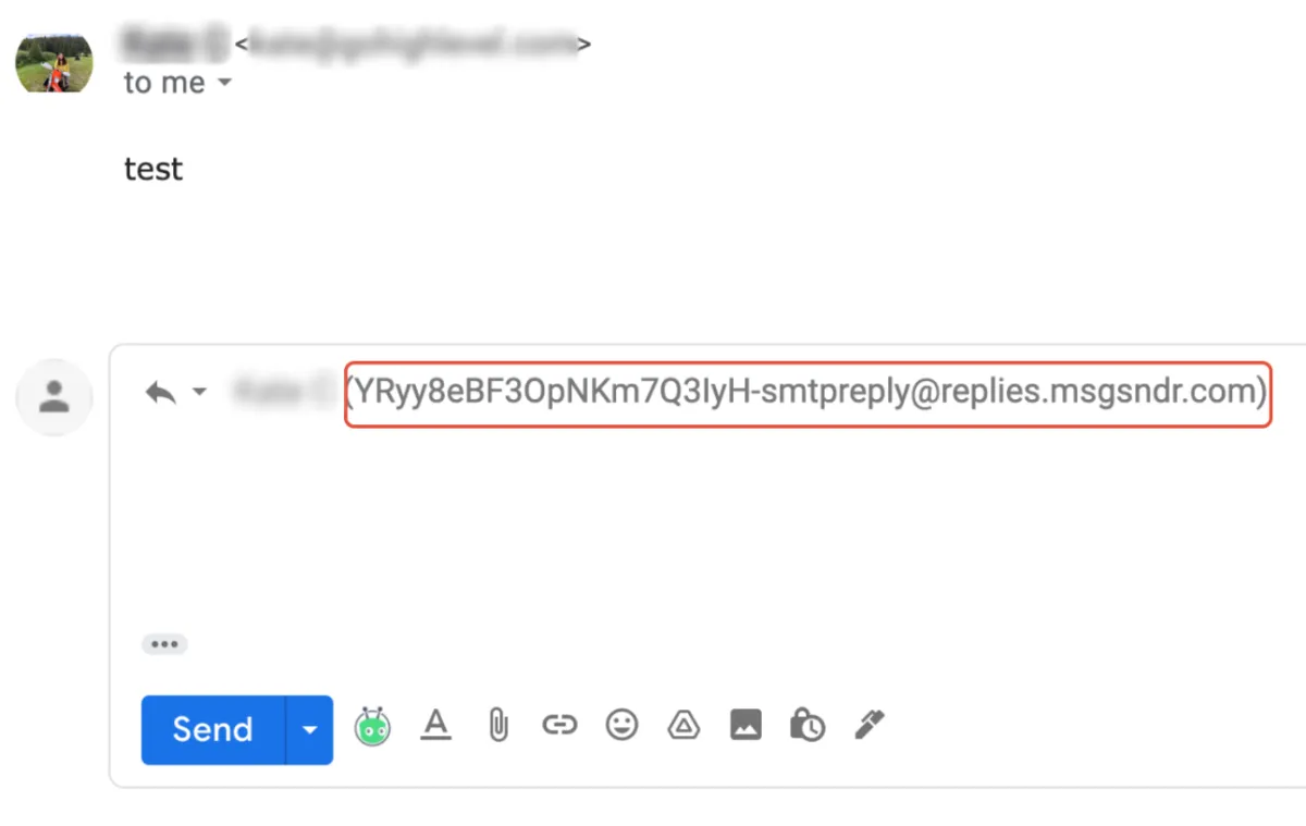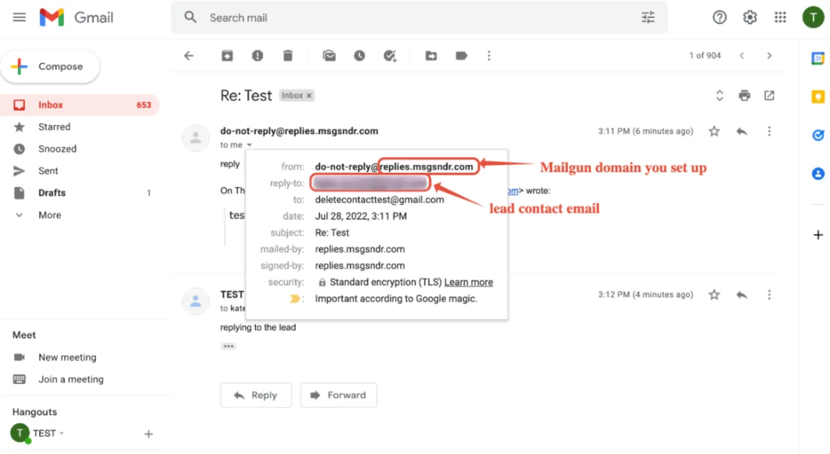 Wenn Sie die E-Mail-Adresse des Absenders wie „testing@gmail.com“ maskieren, wird die Antwortadresse als „testing@replies.subdomain.com“ angezeigt. Dies ist die Mailgun-Subdomäne, die wir für den Standort in den Agentureinstellungen -> Mailgun eingerichtet haben .