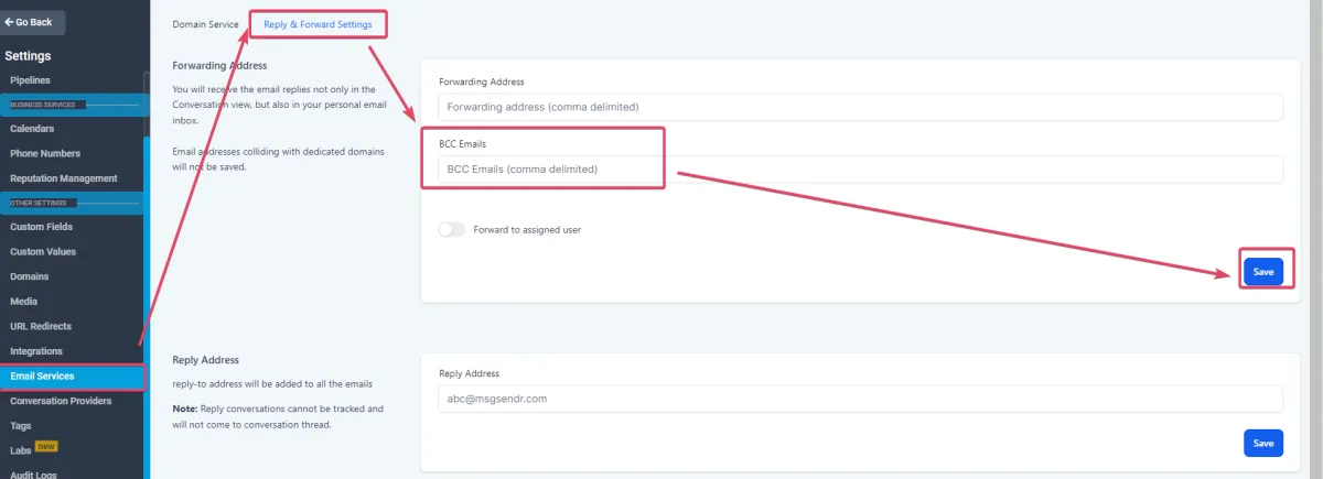 WICHTIG: Weiterleitungsadressen und BCC-E-Mails funktionieren NUR bei Verwendung von Mailgun und LC Email. Andere SMTP-Anbieter werden nicht unterstützt.