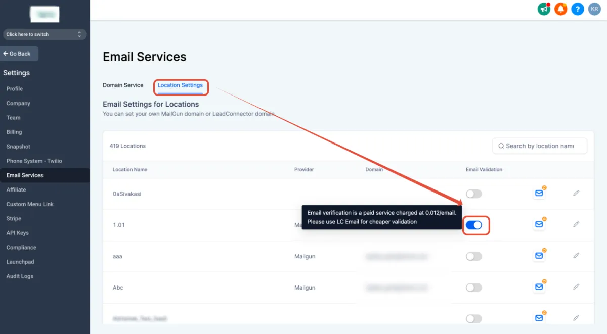 4. Aktivieren Sie die E-Mail-Validierung, indem Sie auf den Umschalter vor dem gewünschten Unterkonto klicken.