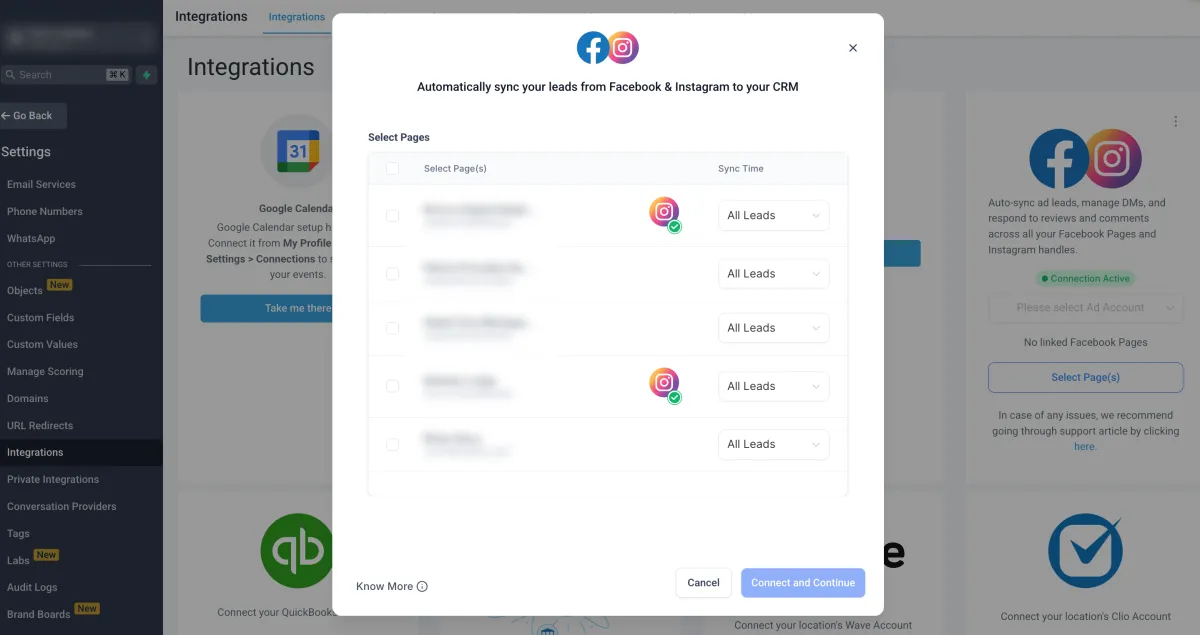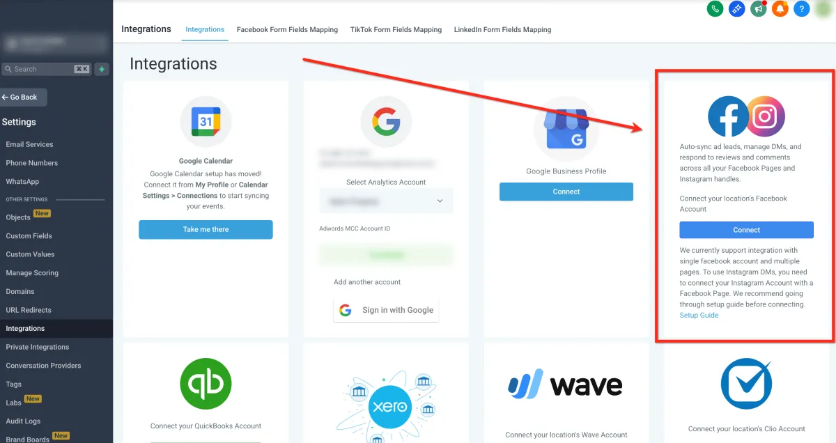 Suchen Sie die Facebook-Instagram- Karte im oberen rechten Bereich des Integrationsbildschirms und klicken Sie auf Verbinden