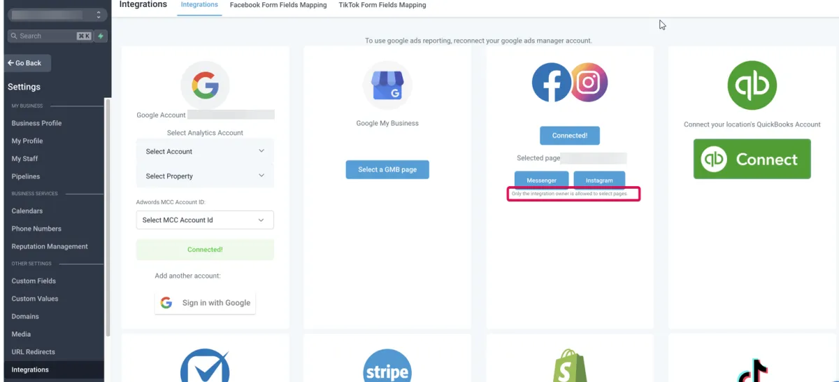Lead-Zugriff: Überprüfen Sie, ob Sie Lead-Zugriff haben. Wenn der Lead-Connector nicht angezeigt wird, müssen Sie ihn möglicherweise manuell suchen oder aktivieren. Bei Problemen mit nicht synchronisierten Leads lesen Sie bitte die Facebook- Anleitung zur Fehlerbehebung für Lead-Anzeigen .