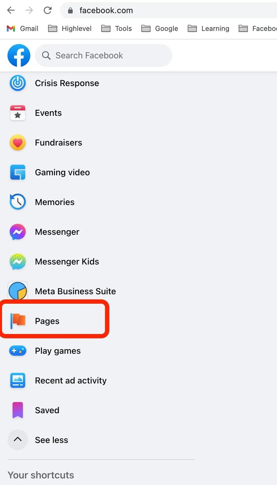 Melden Sie sich bei Facebook an und klicken Sie im linken Menü auf „Seiten“ .