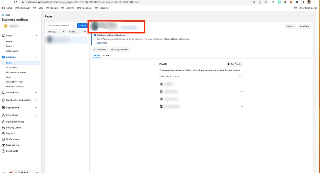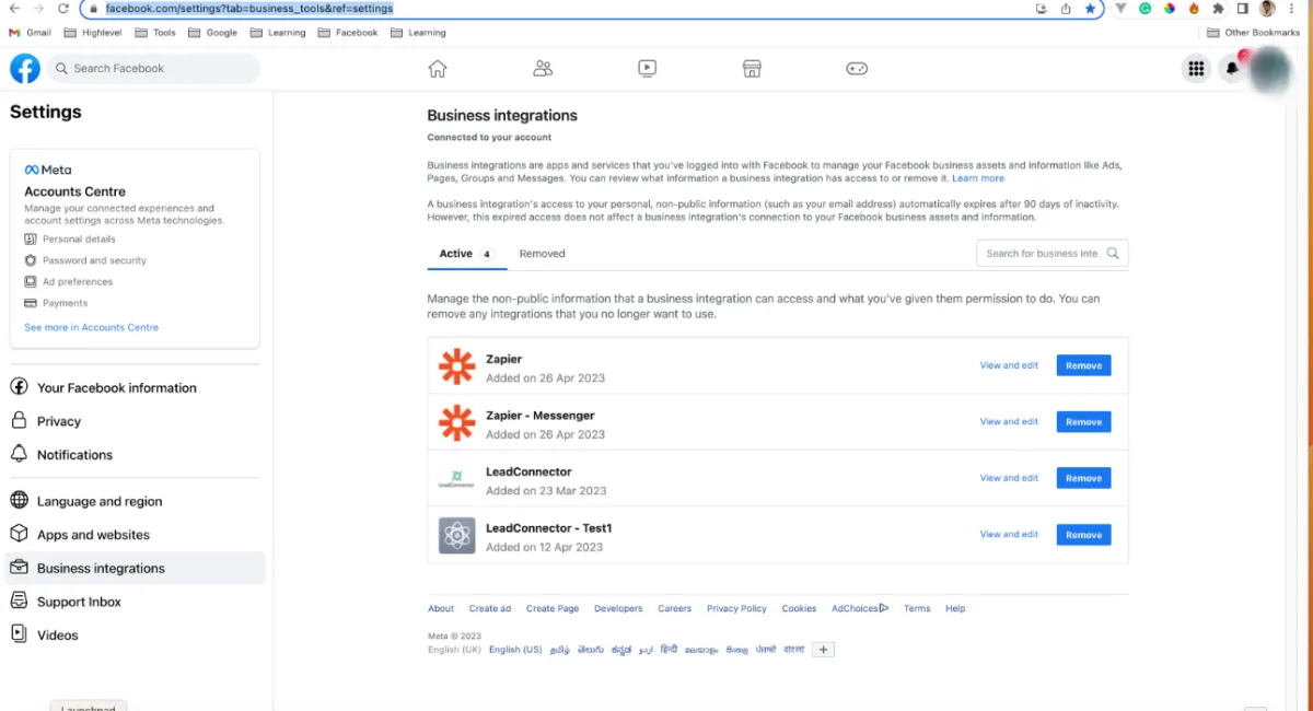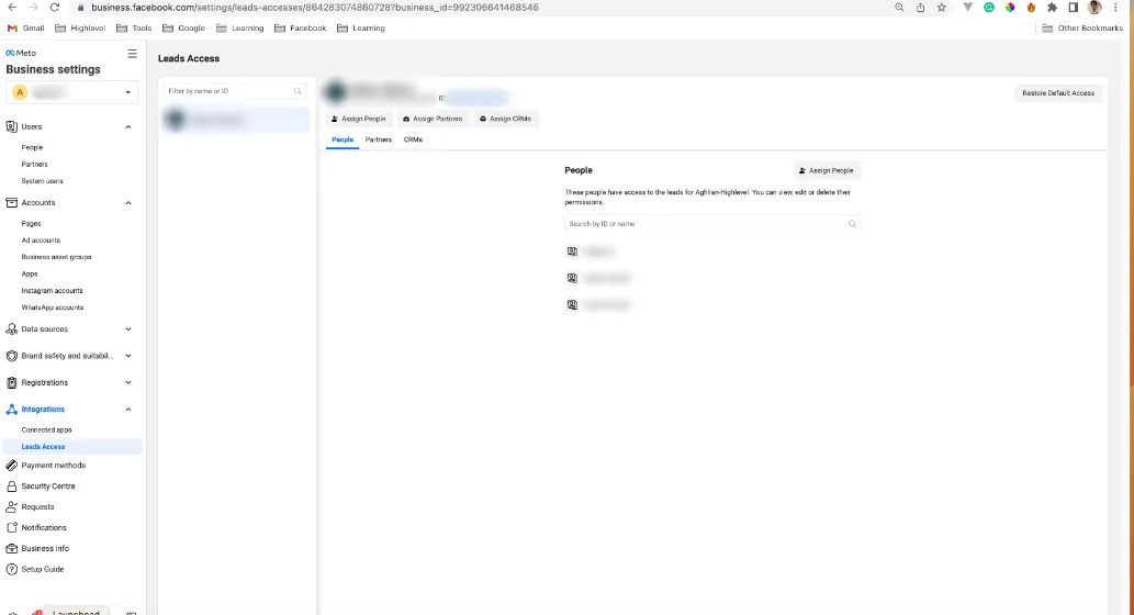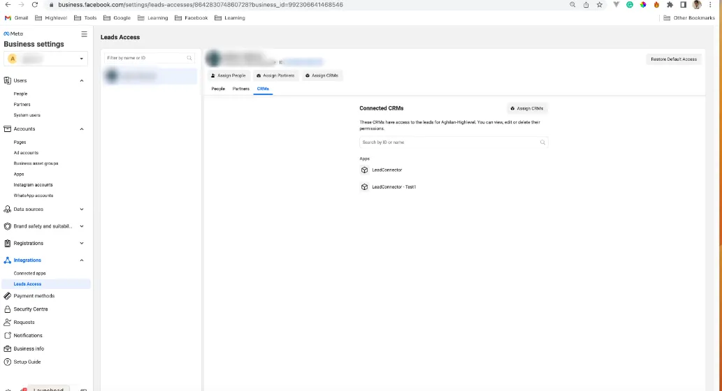 7. Wenn Sie feststellen, dass der LeadConnector-Zugriff auf Ihre Seite widerrufen wurde oder die App-ID nicht angezeigt wird, müssen Sie LeadConnector auf Facebook manuell Zugriffsberechtigungen zuweisen: