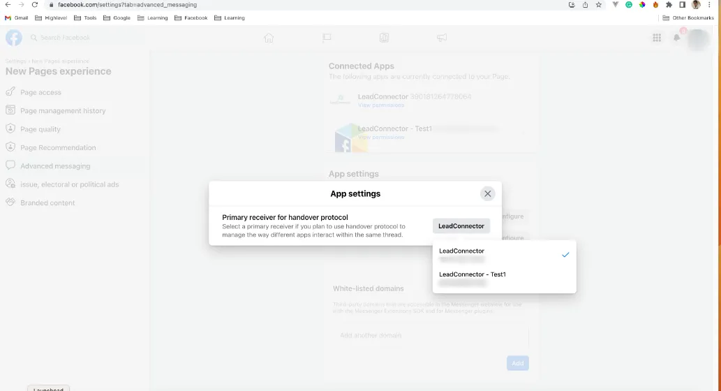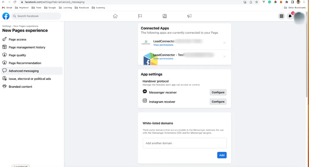 Wenn Sie tatsächlich der FB-Administrator sind, können Sie dies versuchen, um zu bestätigen, ob Lead Connector zugänglich ist und Zugriff auf Ihre Seite gewähren kann?