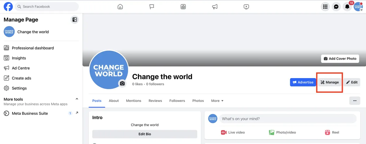 Schritt 3 - Gehen Sie auf die Facebook-Seite und klicken Sie auf Verwalten