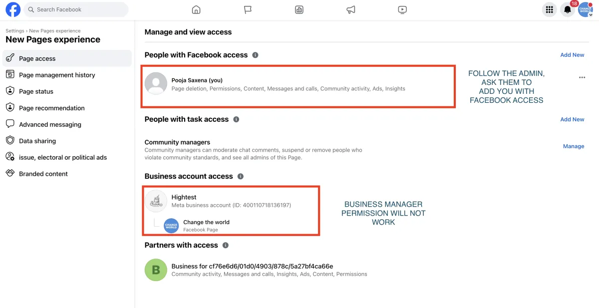 2. Diese Person sollte den Administrator, dem die Seite gehört, in Leute mit Facebook-Zugang (Vollzugriff) einladen.
