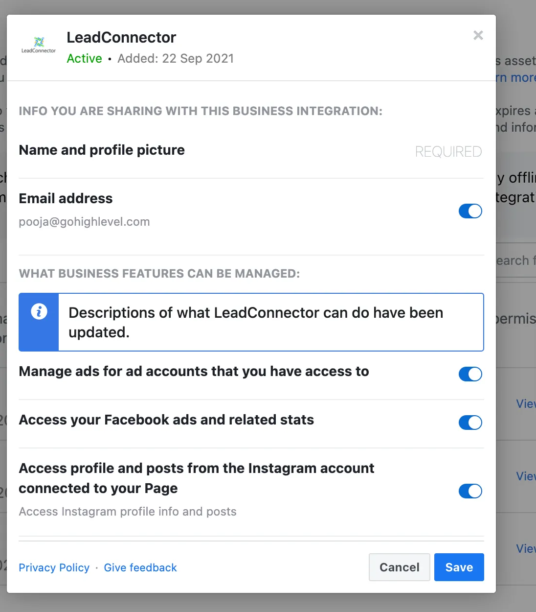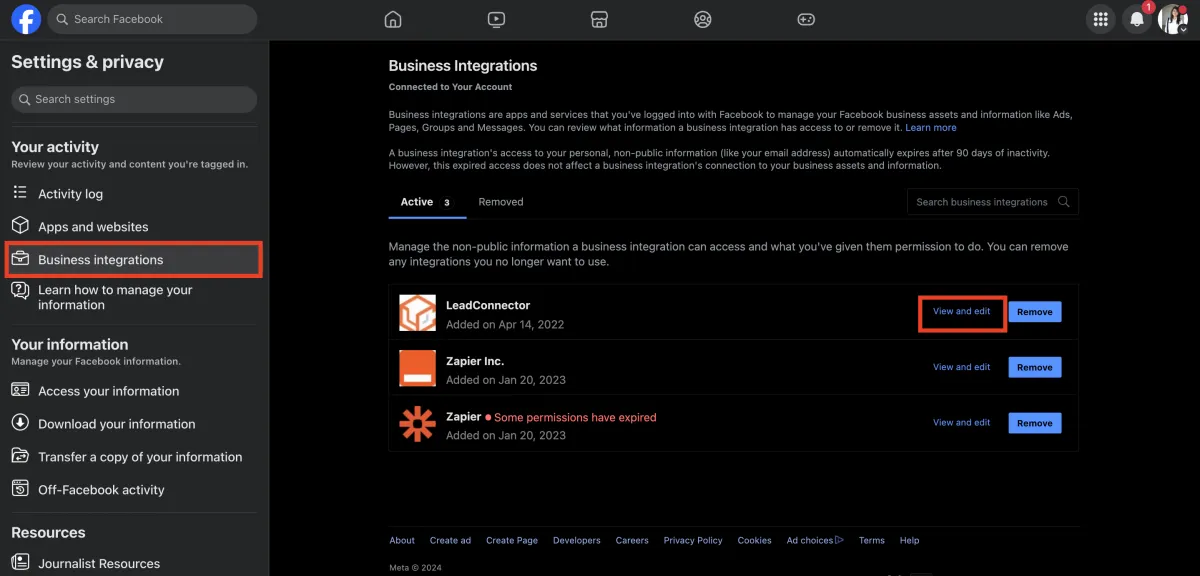 Schritt 4 - Gehen Sie in den Einstellungen zu Business Integration > LeadConnectorSchritt 5 - Klicken Sie auf den Link "Anzeigen und Bearbeiten".