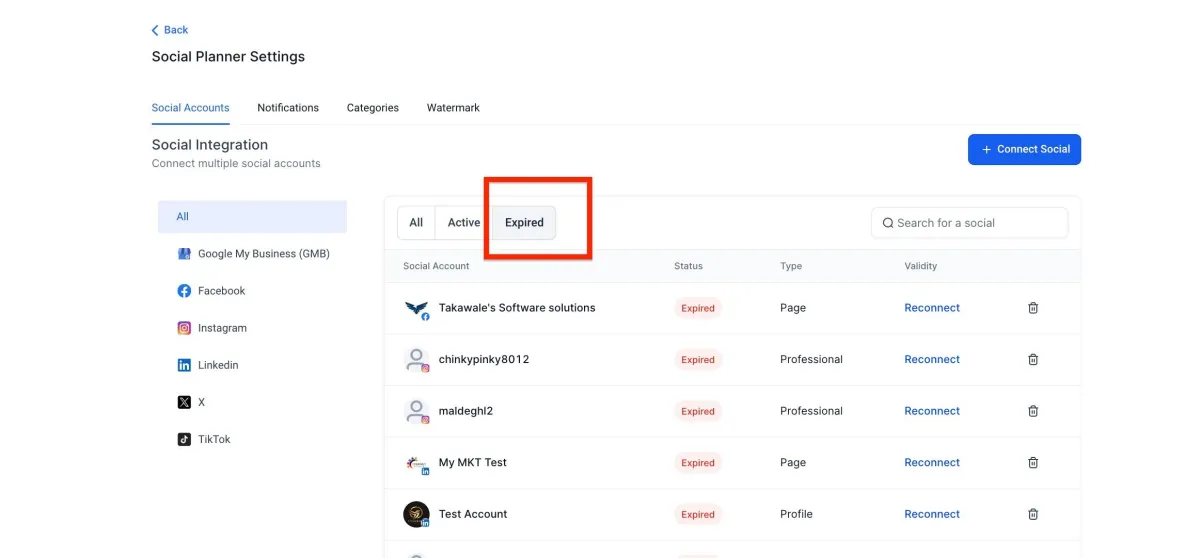 Um eine Seite/Gruppe auf der Registerkarte "Sozialer Planer" wieder zu verbinden, verwenden Sie bitte dasselbe Social-Media-Konto des Benutzers