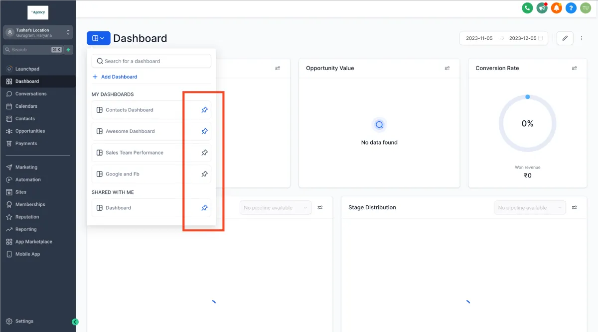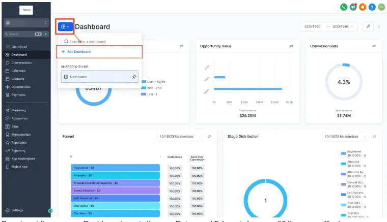 Die Funktion "Mehrere Dashboards" ist eine bahnbrechende Ergänzung zur GHL-Plattform. Sie verbessert Ihr Dashboard-Erlebnis und bietet eine noch nie dagewesene Flexibilität. Mit diesem Update können Benutzer mehrere Dashboards erstellen, verwalten und anpassen, um ihre Datenvisualisierung an individuelle Bedürfnisse anzupassen. Die Einführung dieser Funktionen ermöglicht es Benutzern, ihre analytischen Fähigkeiten zu verbessern und ein intuitiveres und personalisiertes Erlebnis zu bieten.