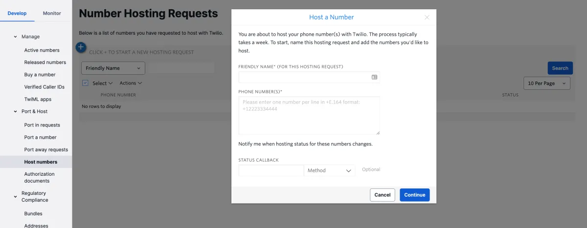 Hosted SMS ermöglicht es Ihnen, Nachrichten auf sprachfähigen Nummern zu senden und zu empfangen, die Sie bereits bei einem anderen Anbieter besitzen. Die Sprachfunktionen der Nummer bleiben unbeeinträchtigt. Wir registrieren die Nummer lediglich für SMS, um die Weiterleitung in und aus der Plattform zu ermöglichen.