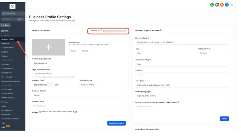 Um die Standort-ID zu finden, gehen Sie bitte zu Standortansicht -> Einstellungen -> Geschäftsprofil, und die Standort-ID wird unten angezeigt, wie gezeigt.