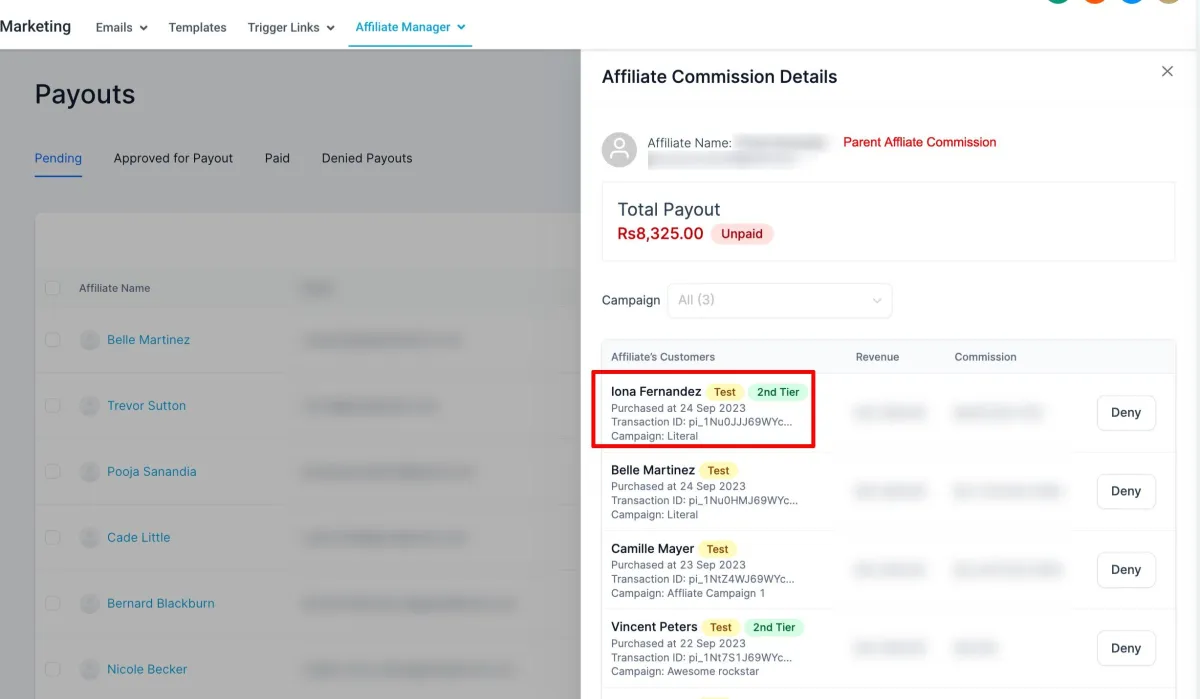 Sobald der Verkauf durch einen Affiliate erfolgt, kann der übergeordnete Affiliate das Netzwerk und die Verkaufsprovision für jeden Affiliate im Netzwerk überprüfen.