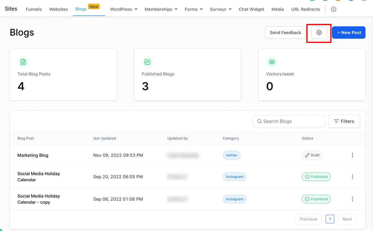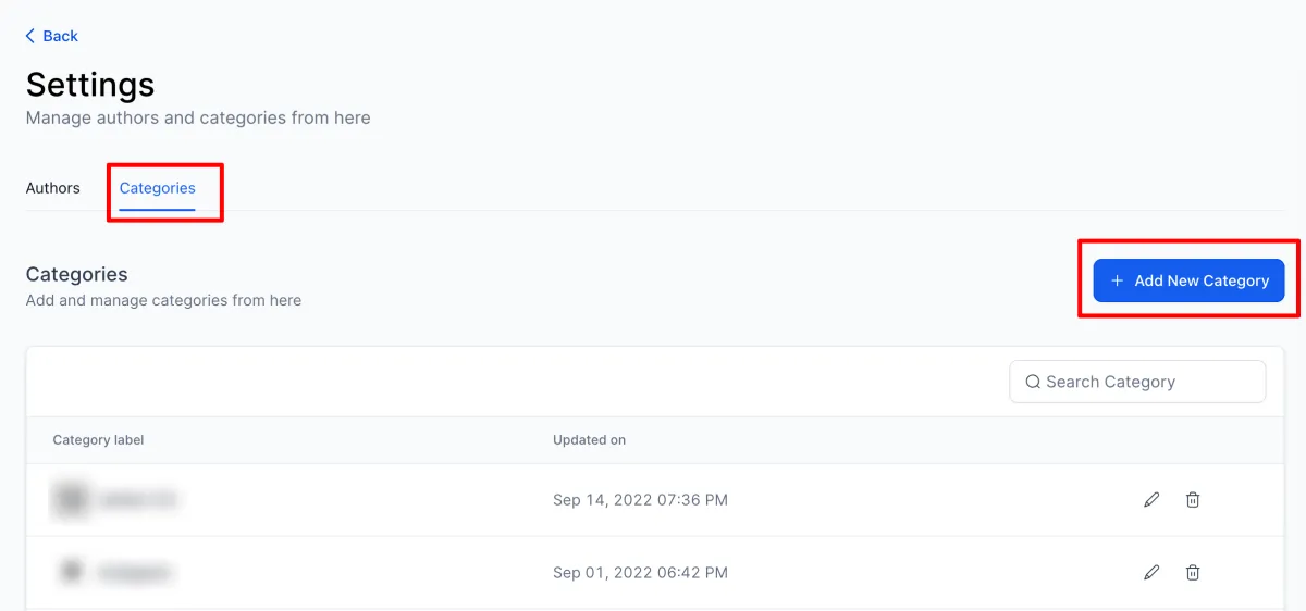 Kategorien werden erstellt unter Blogs > Einstellungen (Zahnrad-Symbol neben dem Button zum Erstellen eines Beitrags)