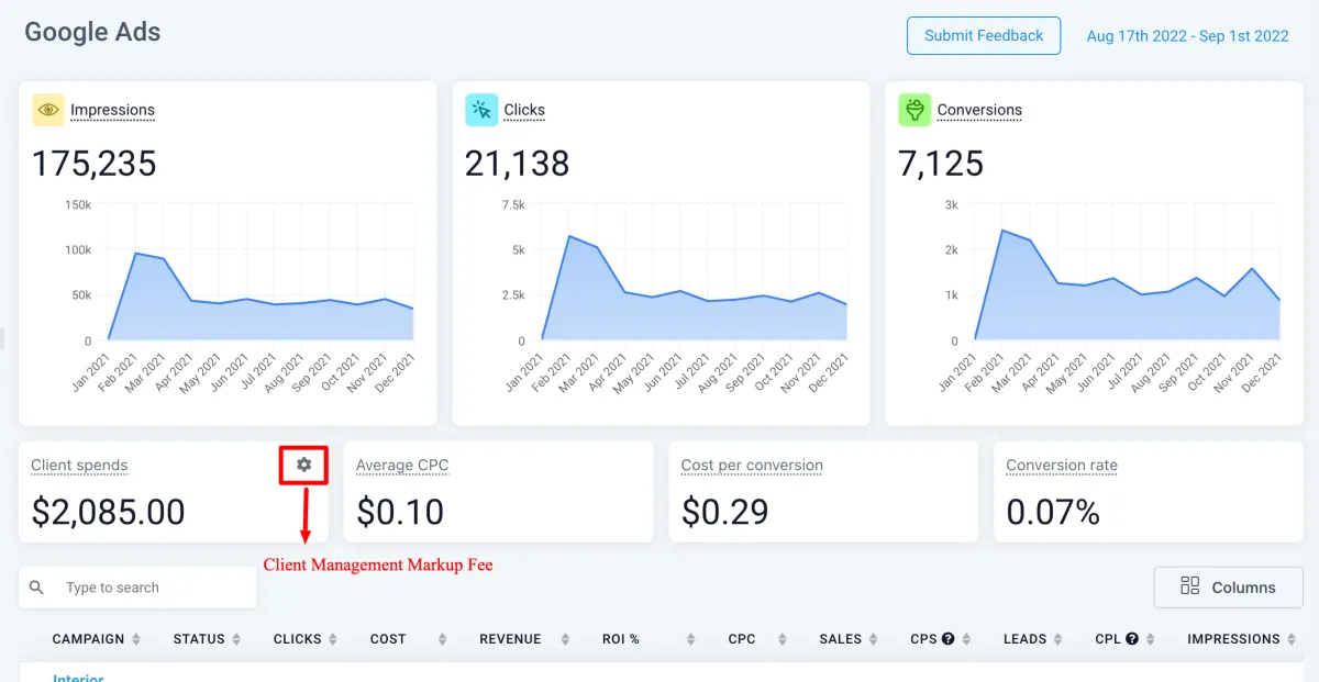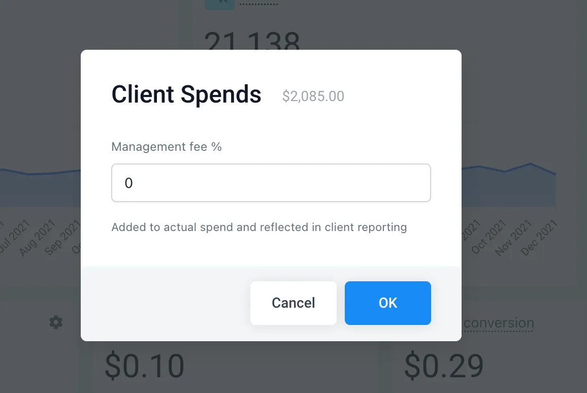 Fügen Sie Ihre monatliche Verwaltungsgebühr zu den Werbeausgaben Ihres Kunden hinzu. Diese Aufschlagsgebühren werden zu allen kostenbezogenen Kennzahlen hinzugefügt.