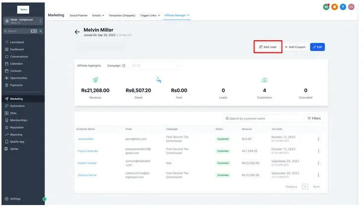 3. Gehen Sie zum entsprechenden Affiliate, bei dem Sie manuelle Leads hinzufügen möchten. Dort finden Sie neben dem Button zum Hinzufügen von Gutscheinen eine Option zum Hinzufügen von Leads.