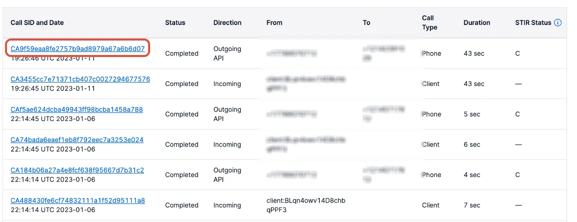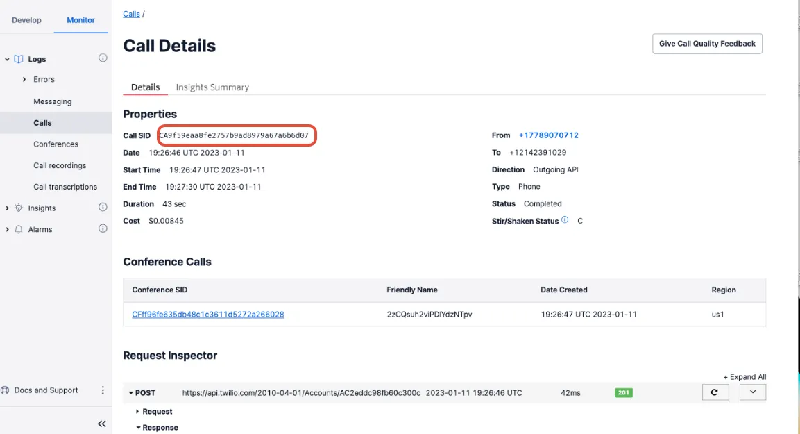 8. Nehmen Sie diese Anruf-ID und erstellen Sie ein Support-Ticket bei Twilio-Support, um mehr zu erfahren