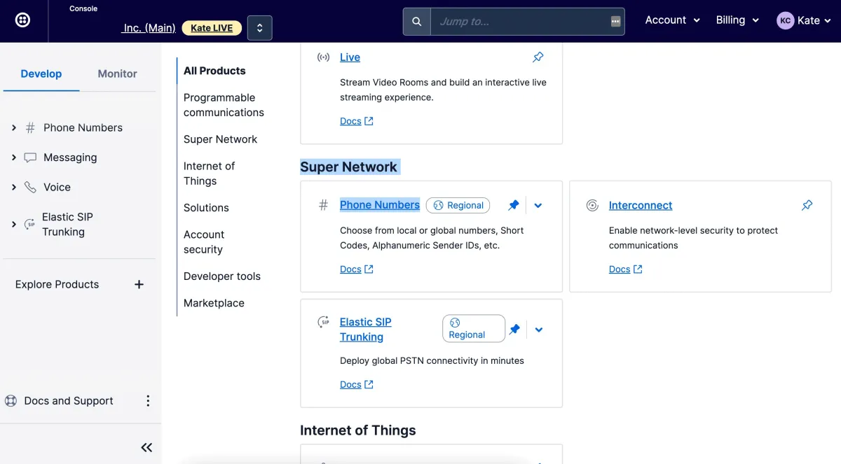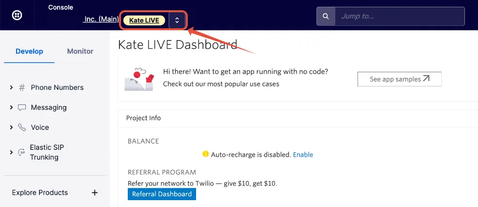 Sobald Sie sich im Unterkonto innerhalb von Twilio befinden: