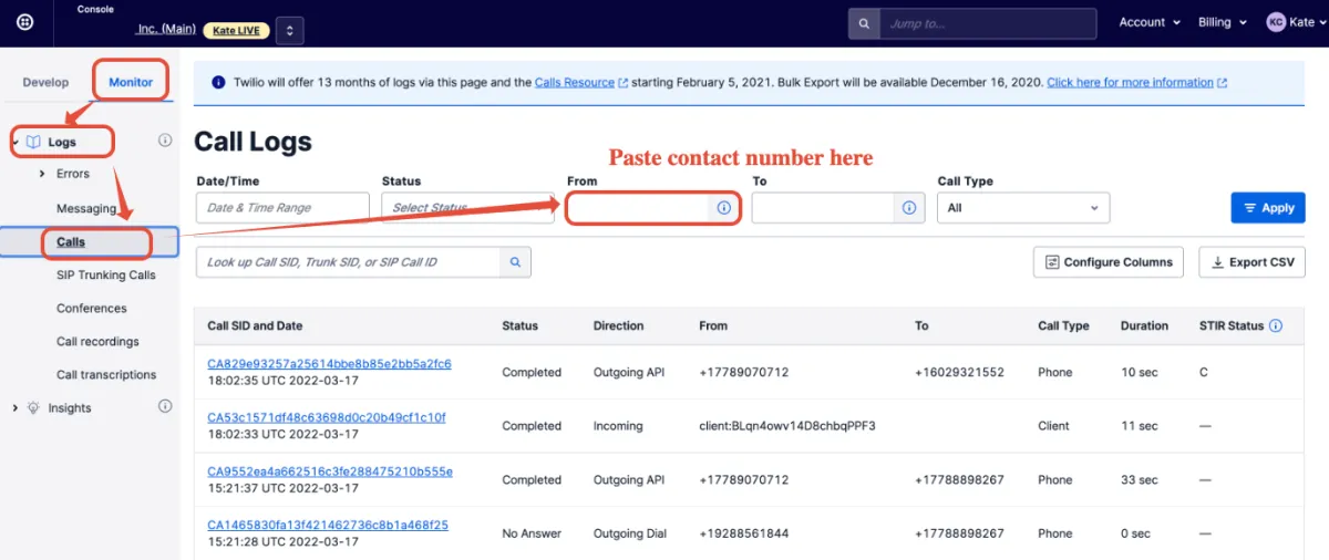 VON-Feld: Stecken Sie das Telefon des Kontakts in das AN-Feld, um eingehende Anrufe zu prüfen. Fügen Sie die Nummer des Kontakts, der Ihre Twilio-Nummer angerufen hat, in das VON-Feld ein.