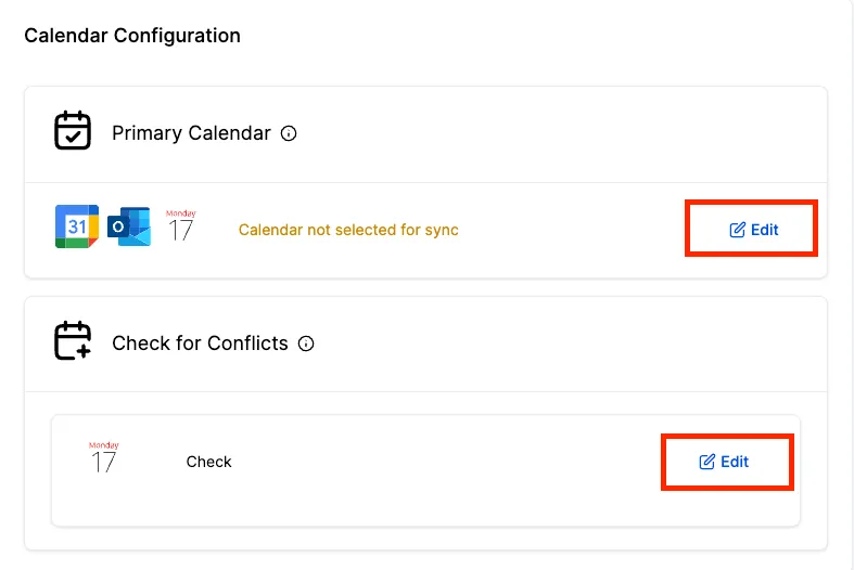 Wenn Sie andere Kalender haben, mit denen Sie vergleichen möchten, um Doppelbuchungen zu vermeiden, können Sie im Feature "Konflikte prüfen" mehrere Kalender hinzufügen. Die Ereignisse aus diesen Kalendern erscheinen ebenfalls im Pilotly-Kalender. Bei der Überprüfung der Verfügbarkeit berücksichtigt der Pilotly-Kalender auch Ereignisse aus diesen Kalendern.