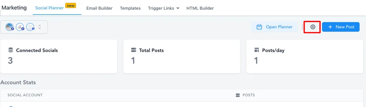 Um zu beginnen, bitte gehen Sie zu Social Planner. In der oberen rechten Ecke von Social Planner gibt es eine Einstellungsoption (Zahnrad-Symbol). Bitte navigieren Sie durch Klicken darauf zu den Einstellungen.