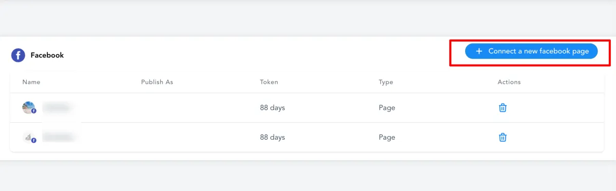 Der nächste Schritt besteht darin, auf "Eine neue Facebook-Seite verbinden" in der Tabelle, wie unten gezeigt, zu klicken, um mehrere Facebook-Seiten zu verwalten.