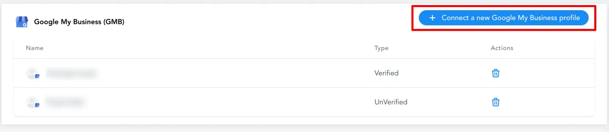 Der nächste Schritt ist, auf "Ein neues Google My Business-Profil verbinden" in der unten gezeigten Tabelle zu klicken, um mehrere GMB-Standorte zu verwalten.