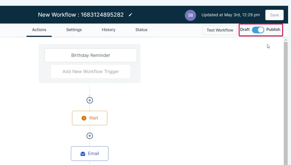 Sobald Sie mit der Einrichtung zufrieden sind, speichern Sie den Workflow und schalten Sie den Schalter auf "Veröffentlichen", um den Workflow zu aktivieren.