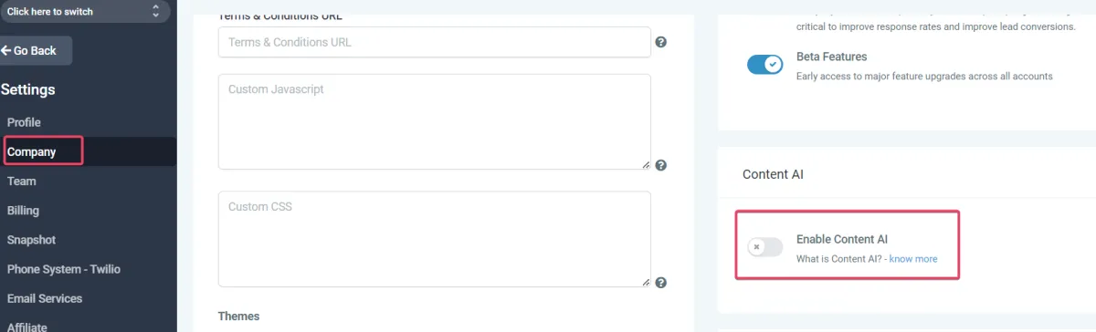 Gehen Sie zu Einstellungen > Unternehmen > Content AI aktivieren, um Content AI zu aktivieren.