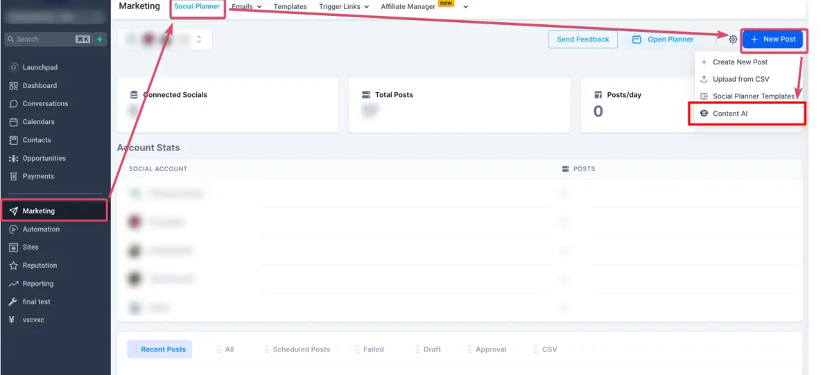 Schritt 1: Gehe zu Marketing > Social Planner > Neuer Beitrag