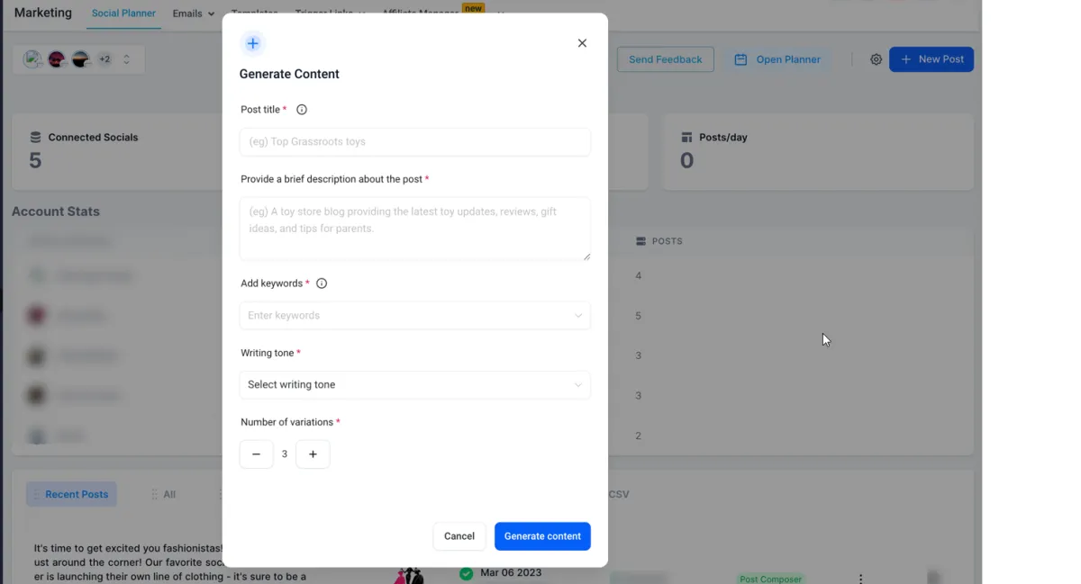 AI-gesteuerter Content AI ist verfügbar für Social Planner, gefolgt von einer allgegenwärtigen Verfügbarkeit für die Erstellung von AI-gesteuertem Inhalt.