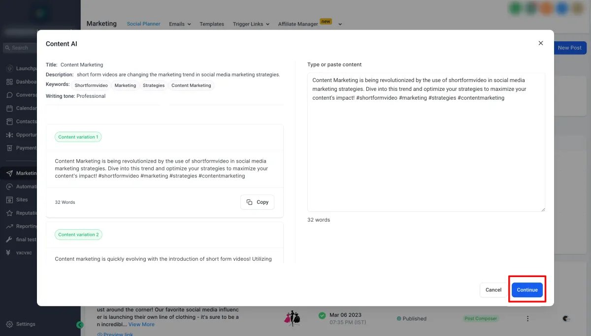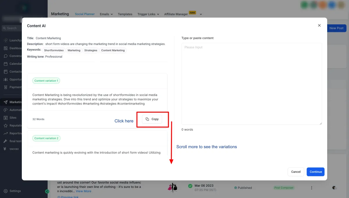 Um den über Content AI generierten Inhalt zu überprüfen, gehen Sie zu Automatisierung> Content AI, um mehr Details zu erfahren und die verschiedenen generierten Inhalte zu sehen.