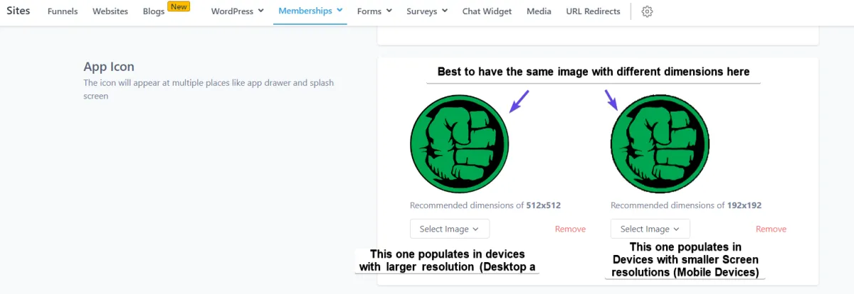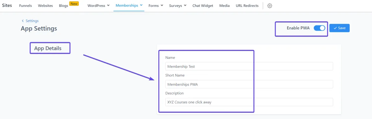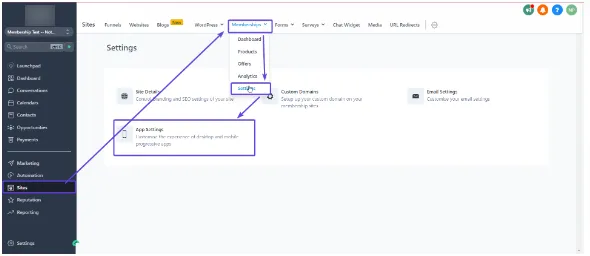Um Ihre Mitgliedschafts-PWA anzupassen, gehen Sie bitte zu Sites> Mitgliedschaften> Einstellungen> App-Einstellungen: