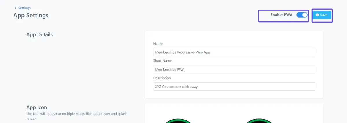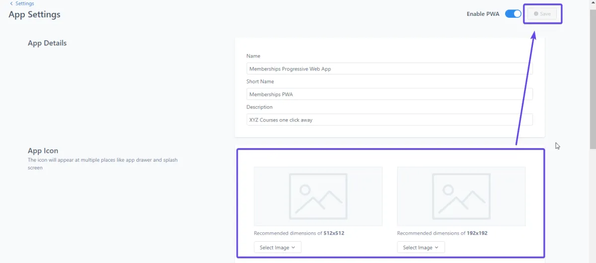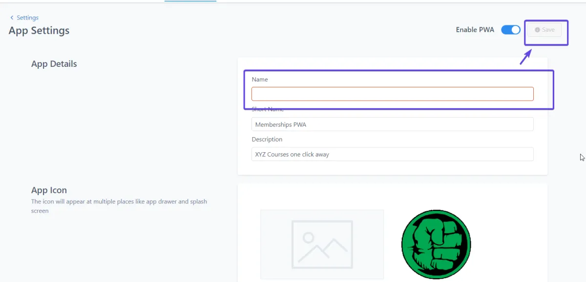 Wenn das Feld "Name" nicht ausgefüllt ist oder wenn Sie nicht einmal ein App-Symbol hochgeladen haben, wird die Schaltfläche "Speichern" ausgegraut, so dass Sie nicht speichern können.