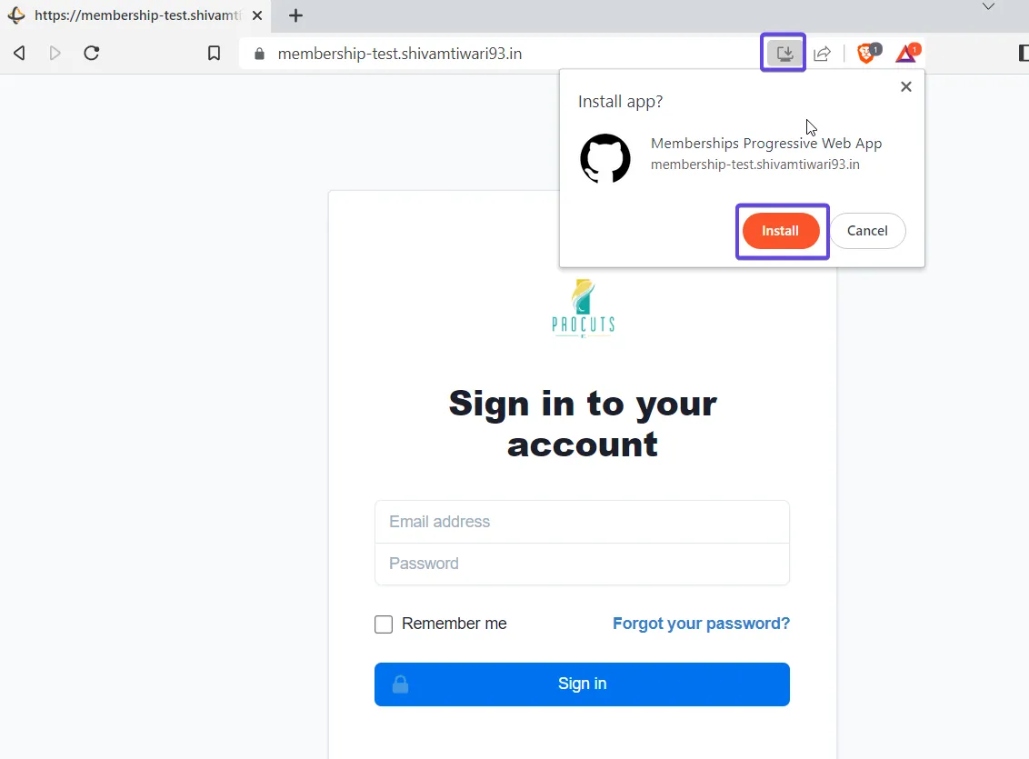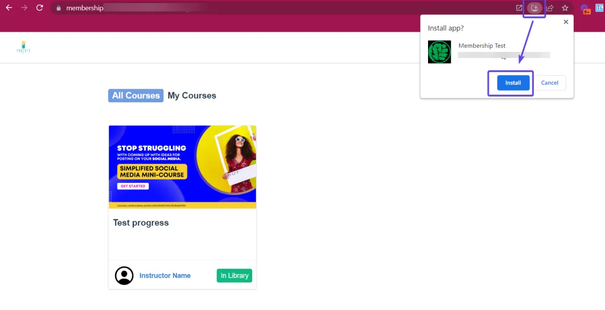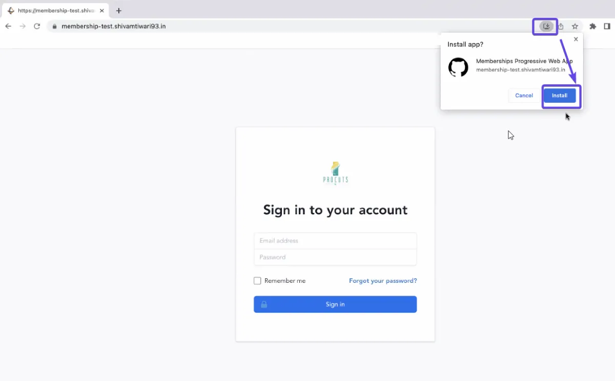 Sobald Ihre PWA-Konfigurationen abgeschlossen sind und die PWA aktiviert ist, können Ihre Kunden die PWA für Mitgliedschaften nur mit einem Chrome-Browser herunterladen, indem sie hier klicken, wenn sie sich bei Ihrem Mitgliedschafts-Login-Portal anmelden: