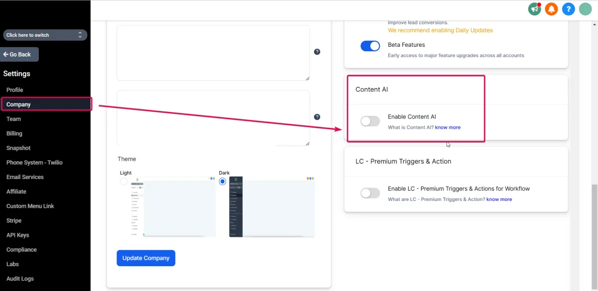 Greifen Sie auf die Funktion zu, indem Sie zu den gehen. Dann können Sie Content AI aktivieren. Es ist für alle Tarife verfügbar. Unternehmen können das erneute Abrechnen einstellen, indem sie zum SaaS-Konfigurator gehen oder zu Unterkonten > Kunden verwalten, wenn sie einen Tarif von 497/Monat oder 4970/Jahr mit SaaS haben.