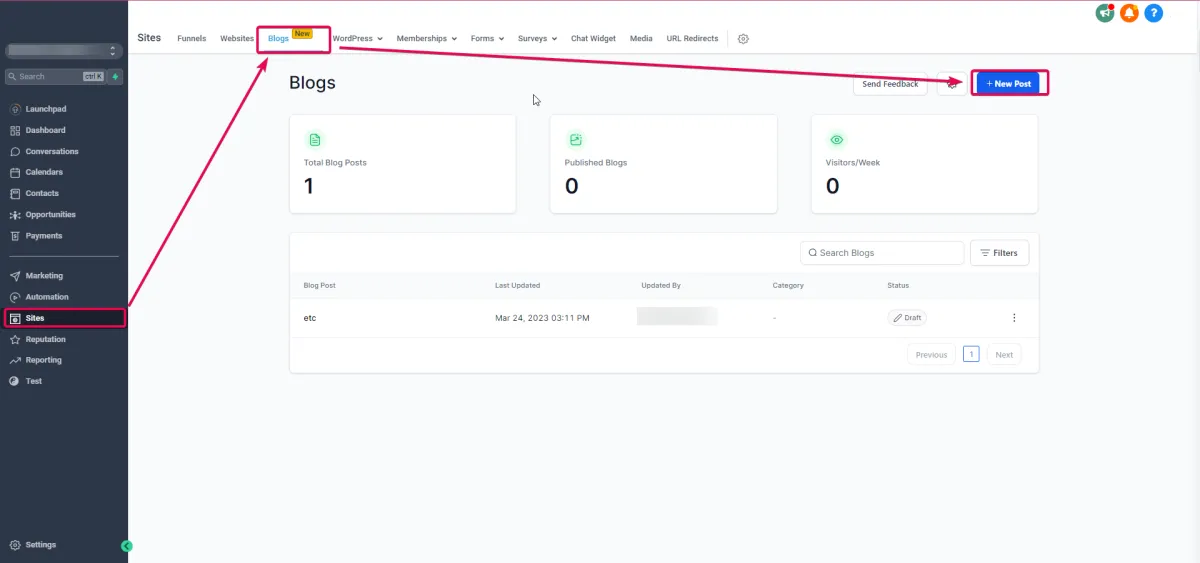 Gehe zu Websites > Blogs > Neuen Beitrag erstellen.