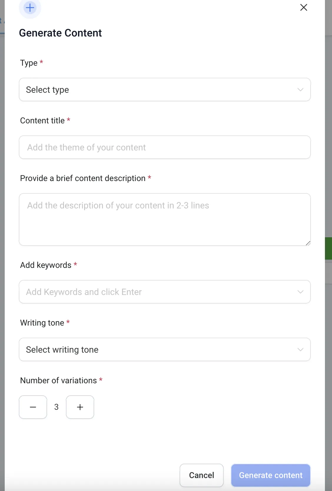 Als Nächstes können Sie zum Blogbeitrags-Editor gehen, wo Content AI verfügbar sein wird. Klicken Sie auf Content AI; es wird Sie bitten, die Option für Gliederung, Einleitung und Spezifischen Abschnitt zu wählen und den Beitrags-Titel, die Beitrags-Beschreibung, Schlüsselwörter, den Ton des Inhalts und mehrere Variationen zu schreiben.