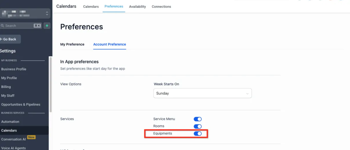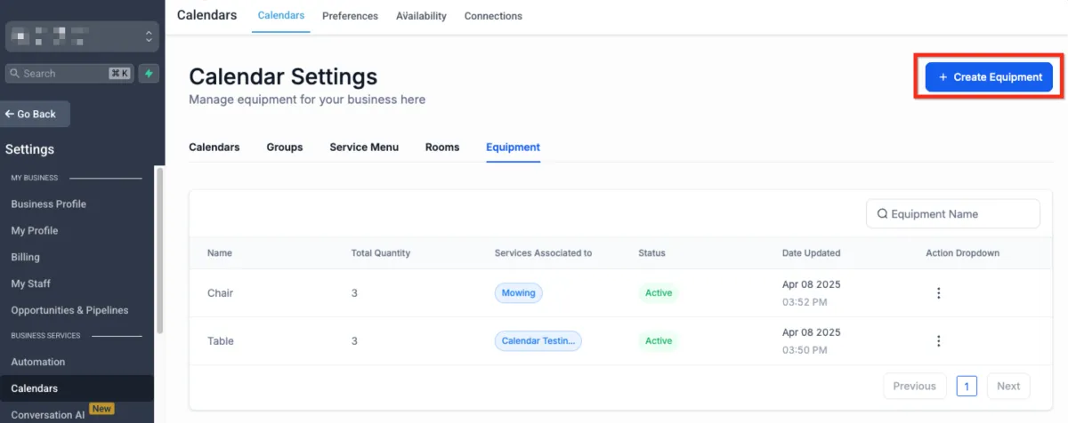 Das Einrichten von Ausrüstung ermöglicht es Ihnen, gemeinsam genutzte physische Ressourcen zu verwalten – wie Massagetische, Untersuchungsstühle oder Projektoren – die während geplanter Dienstleistungen verwendet werden. Durch die Verknüpfung von Ausrüstung mit Kalendern verhindern Sie Doppelbuchungen und erhalten die betriebliche Effizienz.