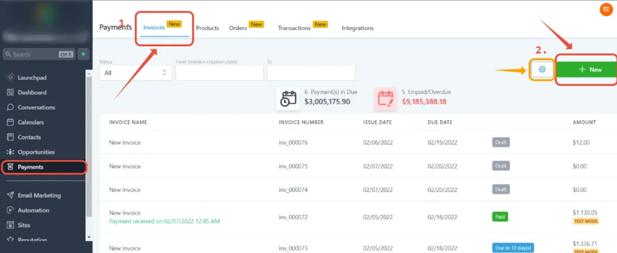 1. Gehen Sie zum Zahlungen-Tab und klicken Sie auf den Rechnungs-Tab.