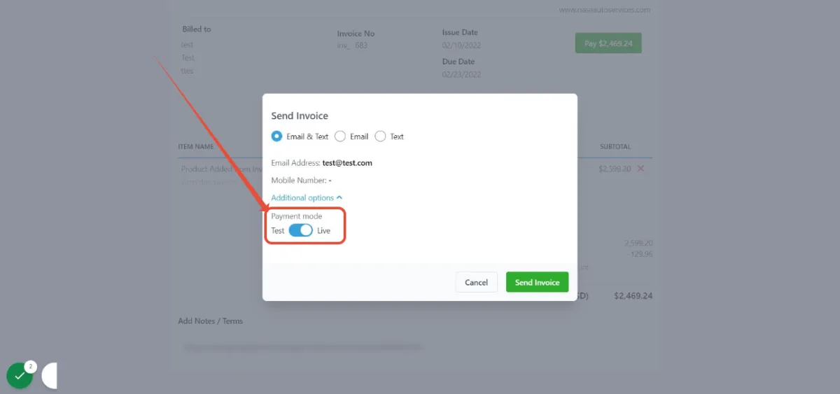 Schritt 2: Sie können die Rechnung per E-Mail und SMS nach Belieben versenden, und Sie können diese auch im Testmodus senden.