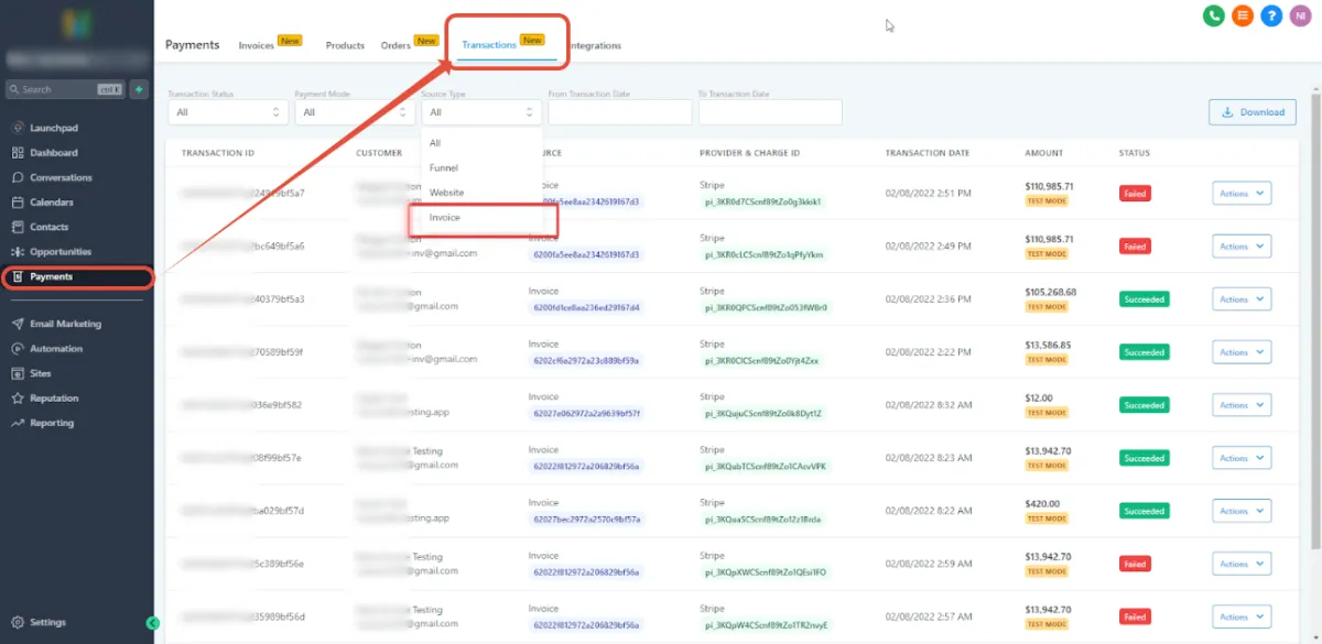 Sie können auch nach erfolgreichen oder fehlgeschlagenen Transaktionen im Zusammenhang mit Rechnungen suchen.