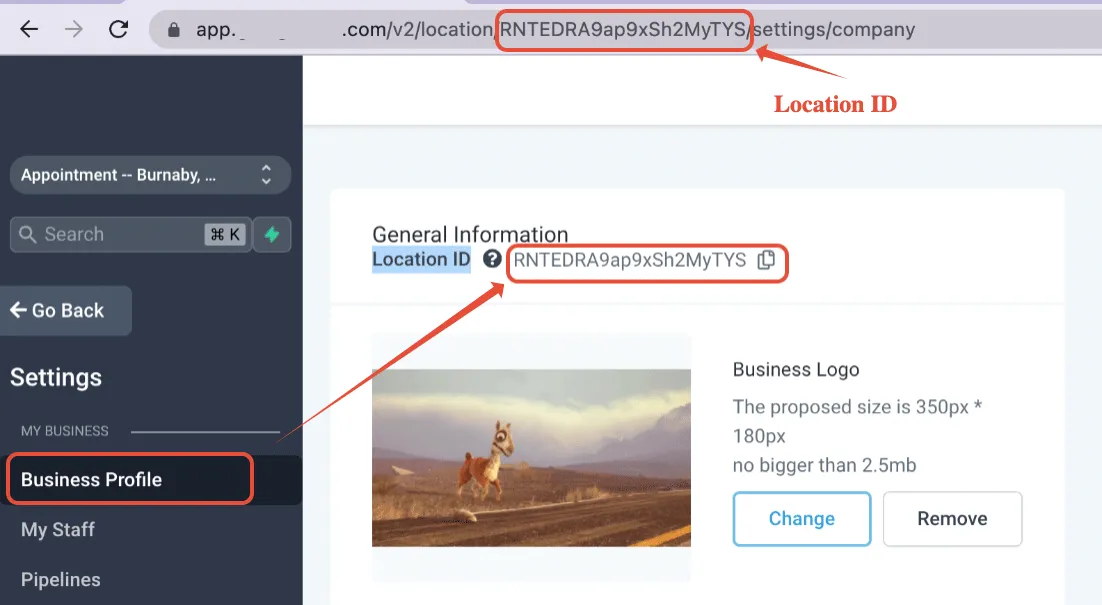 Klicken Sie auf Standorteinstellungen > Geschäftsprofil, um die Standort-ID zu finden