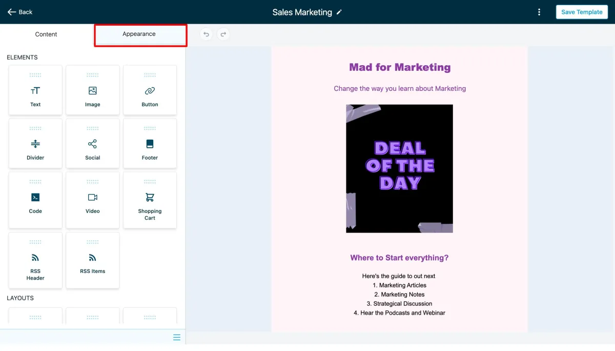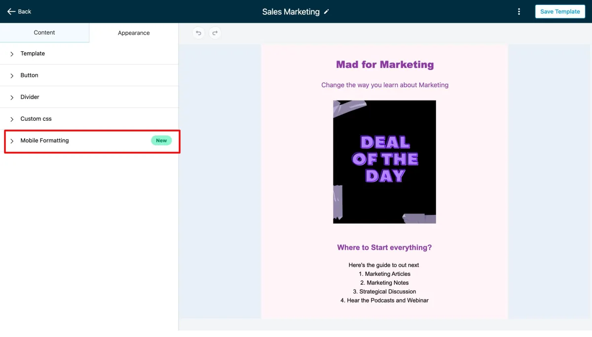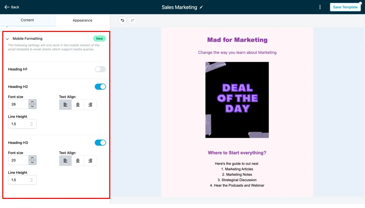 Um mobile Stile in einer Drag-and-Drop-Vorlage - Design-Editor zu bearbeiten, folgen Sie diesen Schritten:
