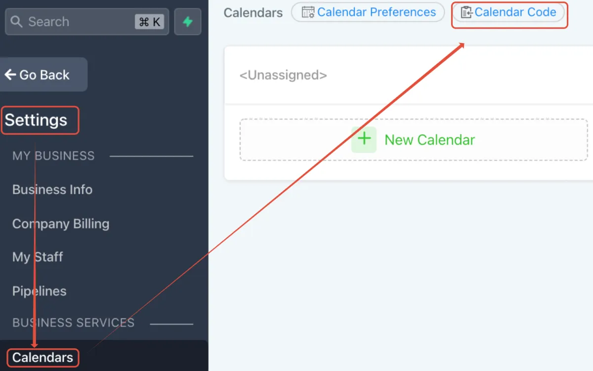 Um Ihre Kalender-ID zu finden, gehen Sie bitte in Ihre Unterkonto-Einstellungen > Klicken Sie auf 'Kalender-Code' > Filtern Sie nach Ihrem spezifischen Kalender > Klicken Sie auf den 'Einbettungscode' oder 'URL' kopieren Button