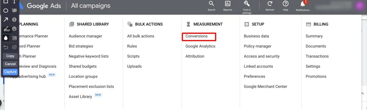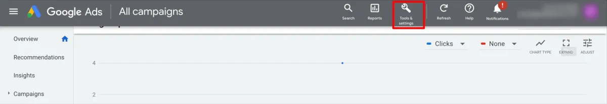 In Ihrem Google Ads-Konto gehen Sie zu Werkzeuge und Einstellungen.