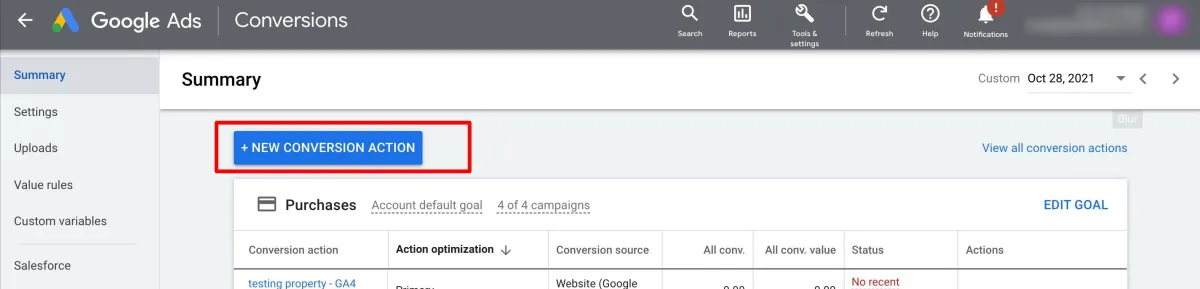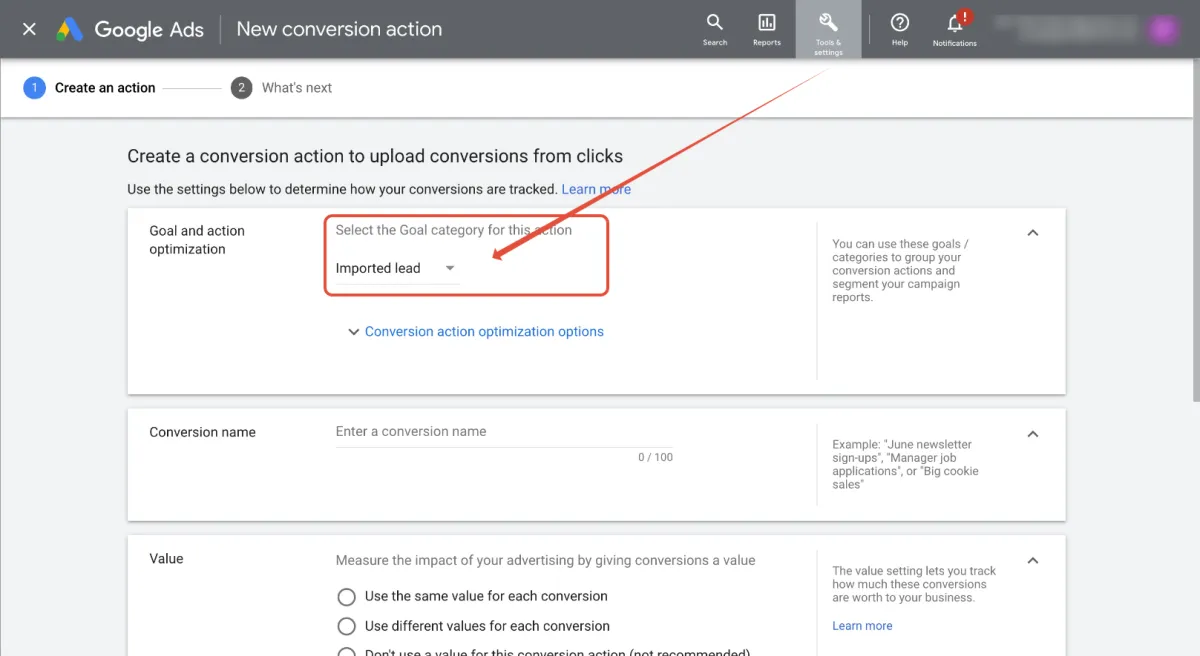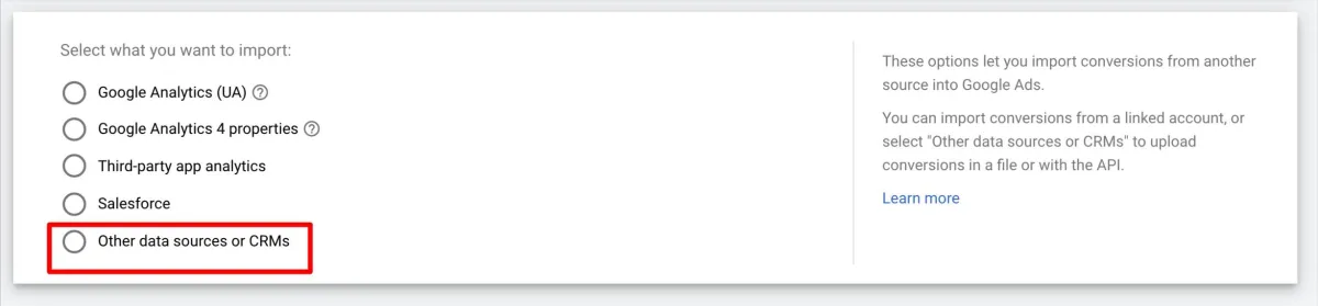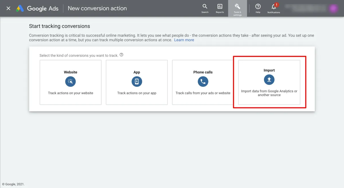 Um die Konversion zu verfolgen, müssen wir die Importoption wählen.