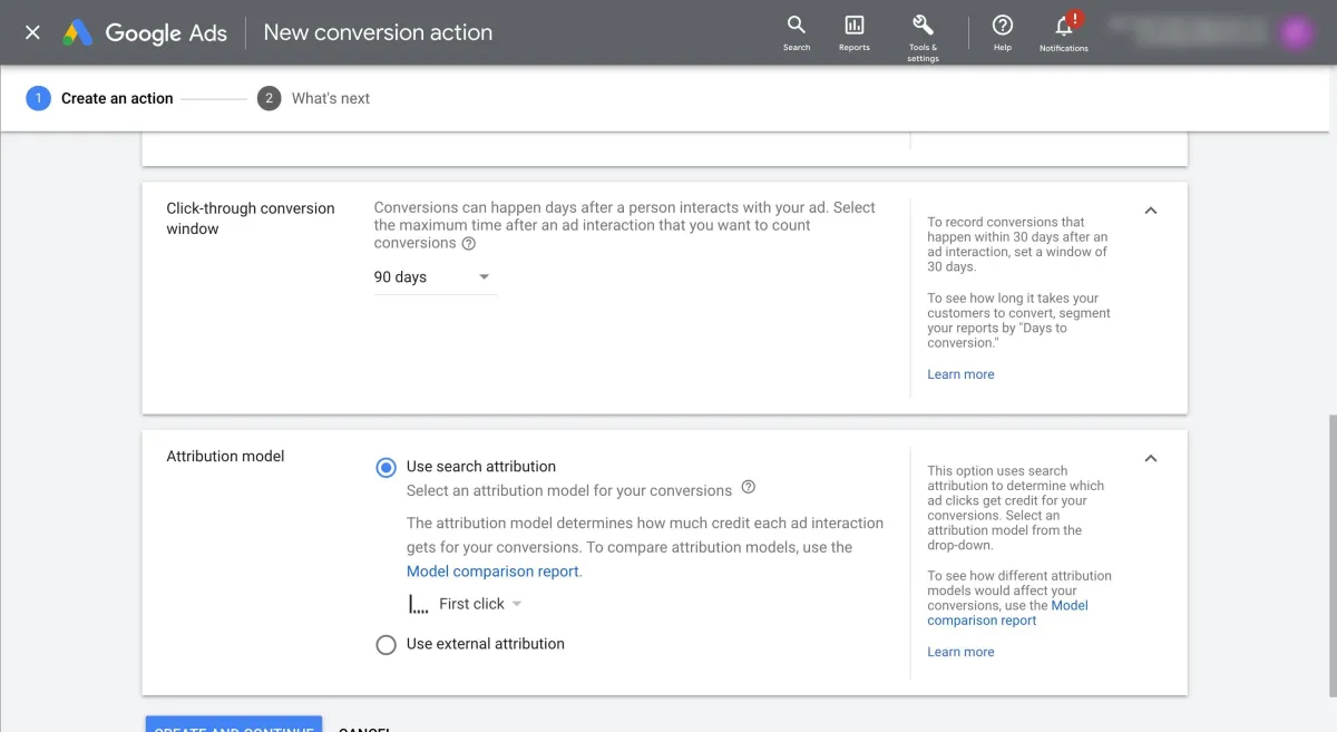 Als Nächstes setzen Sie die Konversion bei Klick auf 90 Tage und wählen Sie als Attributionsmodell den Ersten Klick.